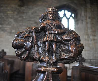 The church has some finely carved medieval bench-ends and some mediaeval graffiti. The bench-ends came from a nearby Abbey which was closed down during the dissolution. The church guide tells us that tests on the back boards have suggested a date of mid 15th century. Symbols carved in to the bench-ends include monks, noble men, eagles, lions, dragons and a green man. It is thought that some of these are symbols from those people who helped to finance the abbey.