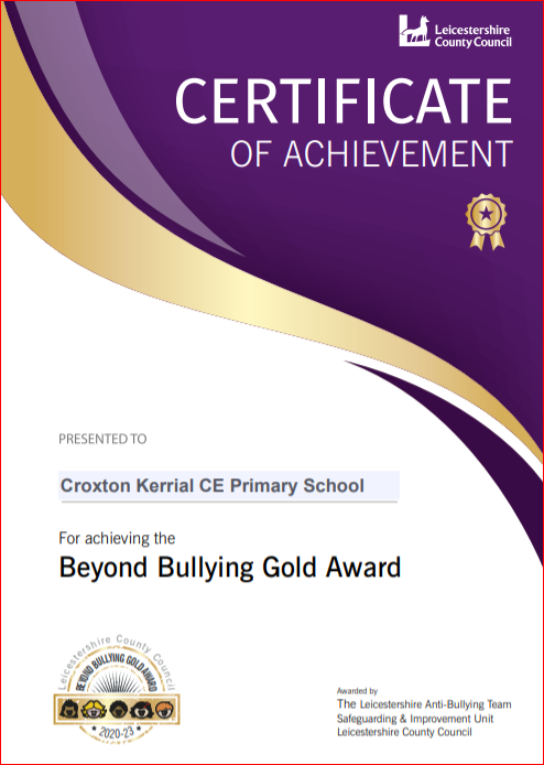 Our children demonstrate exemplary behaviour and as such learn to make sensible choices that promote a healthy mind as well as healthy relationships. These are fundamental to positive well-being. We have been been awarded the GOLD AWARD in the Leicestershire Beyond Bullying Award programme which demonstrates our commitment to supporting children's well-being. A sample from the BBA criteria document.This is a whole school, whole school community approach and we are proud to be recognised as beacons of excellence; please see the criteria document below for further details.