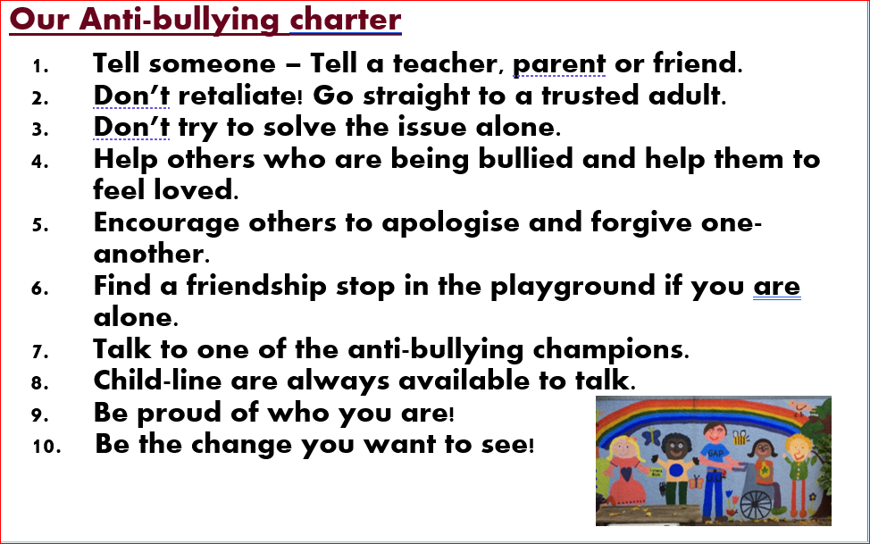 • Ensure that pupils are aware that all bullying concerns will be dealt with sensitively and effectively.